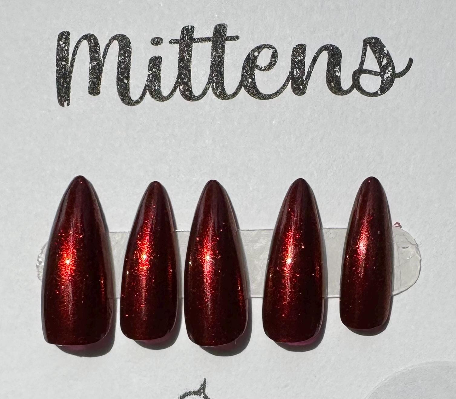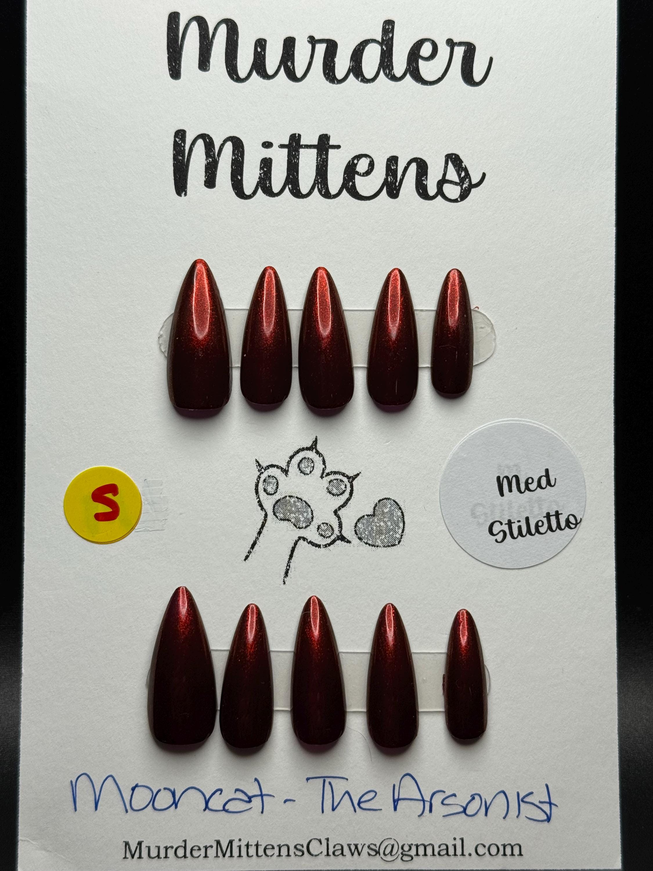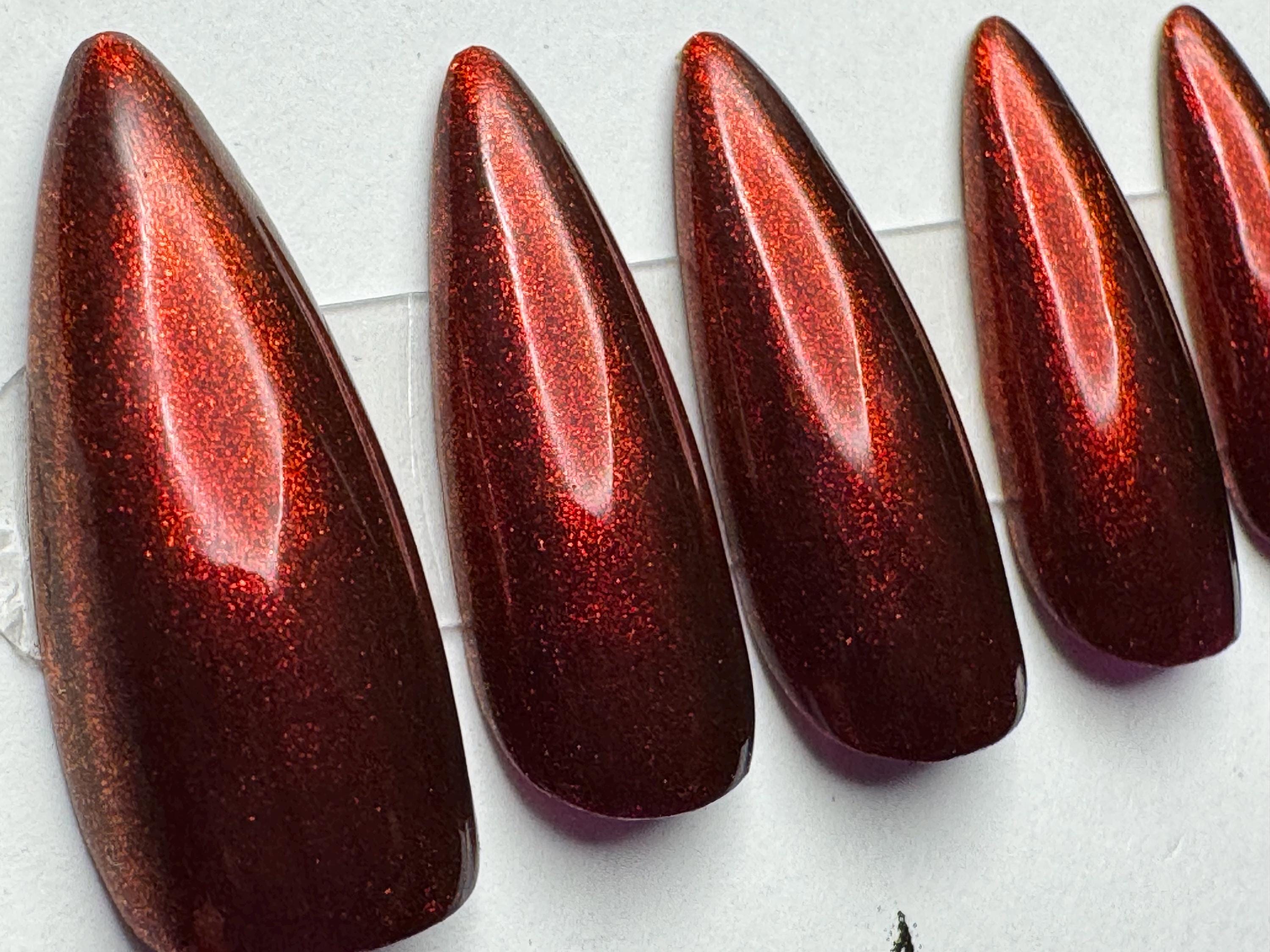 The polish is Mooncat, The Arsonist, with a glossy gel top coat. The size is Small, and the style is Medium Stiletto. The last pic is outside in the sun.