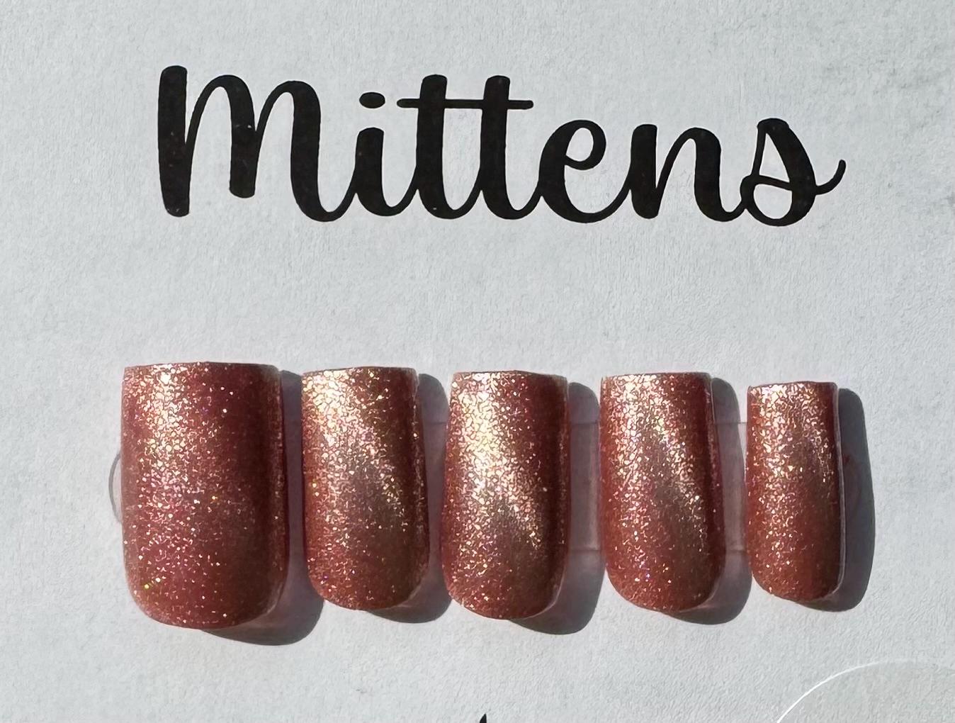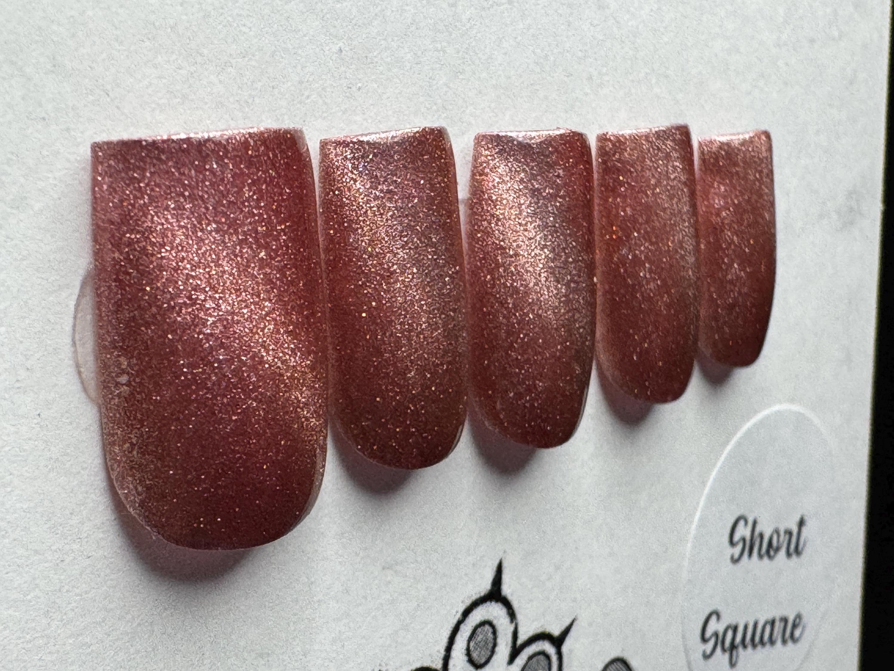 This is a magnetic polish. The polish is Mooncat, Velvet Rose, with a glossy gel top coat. The size is Medium, and the style is Short Square.