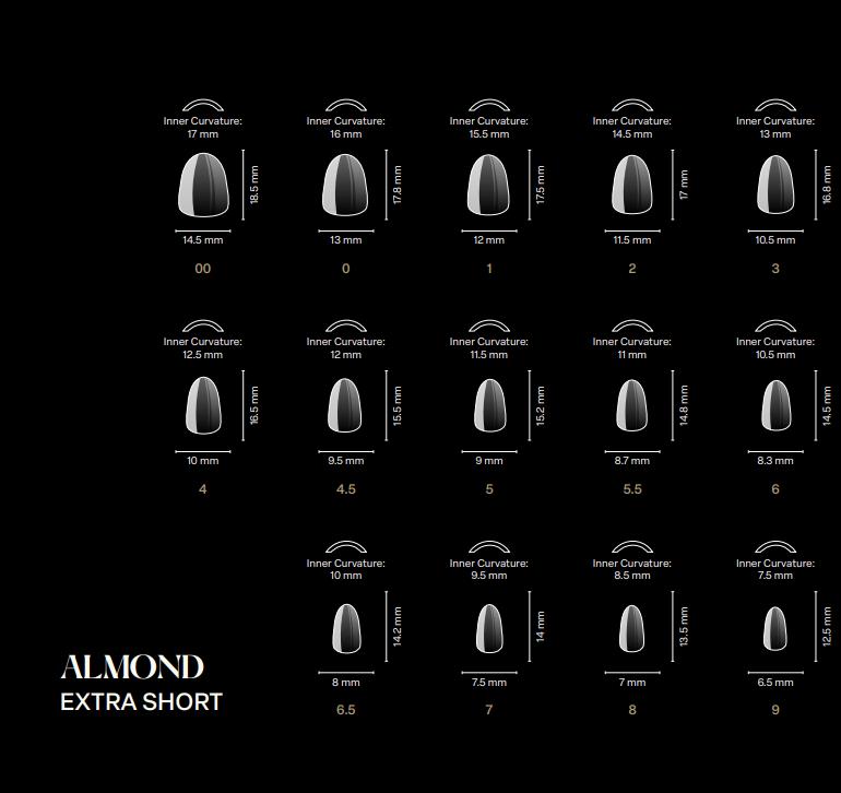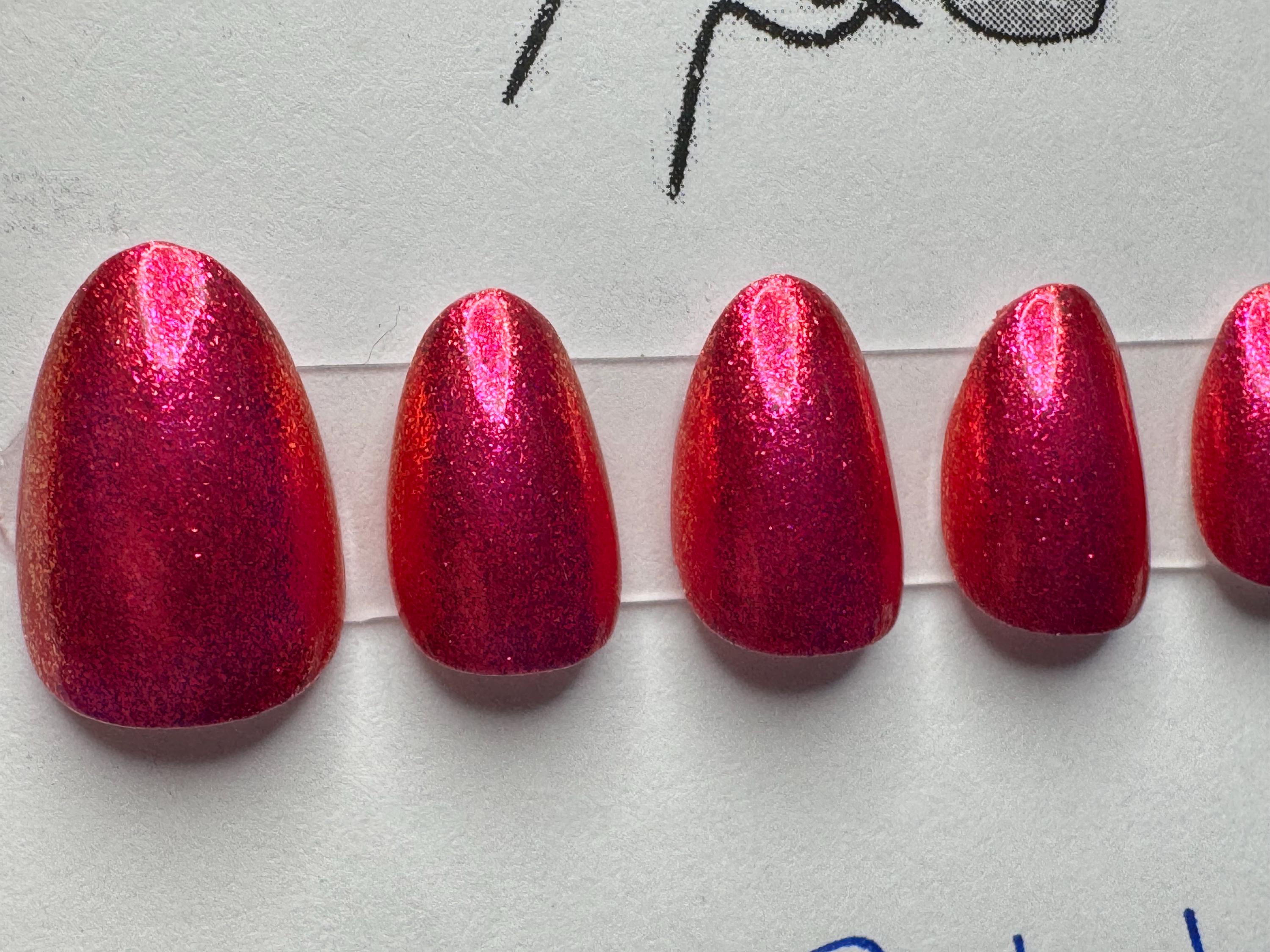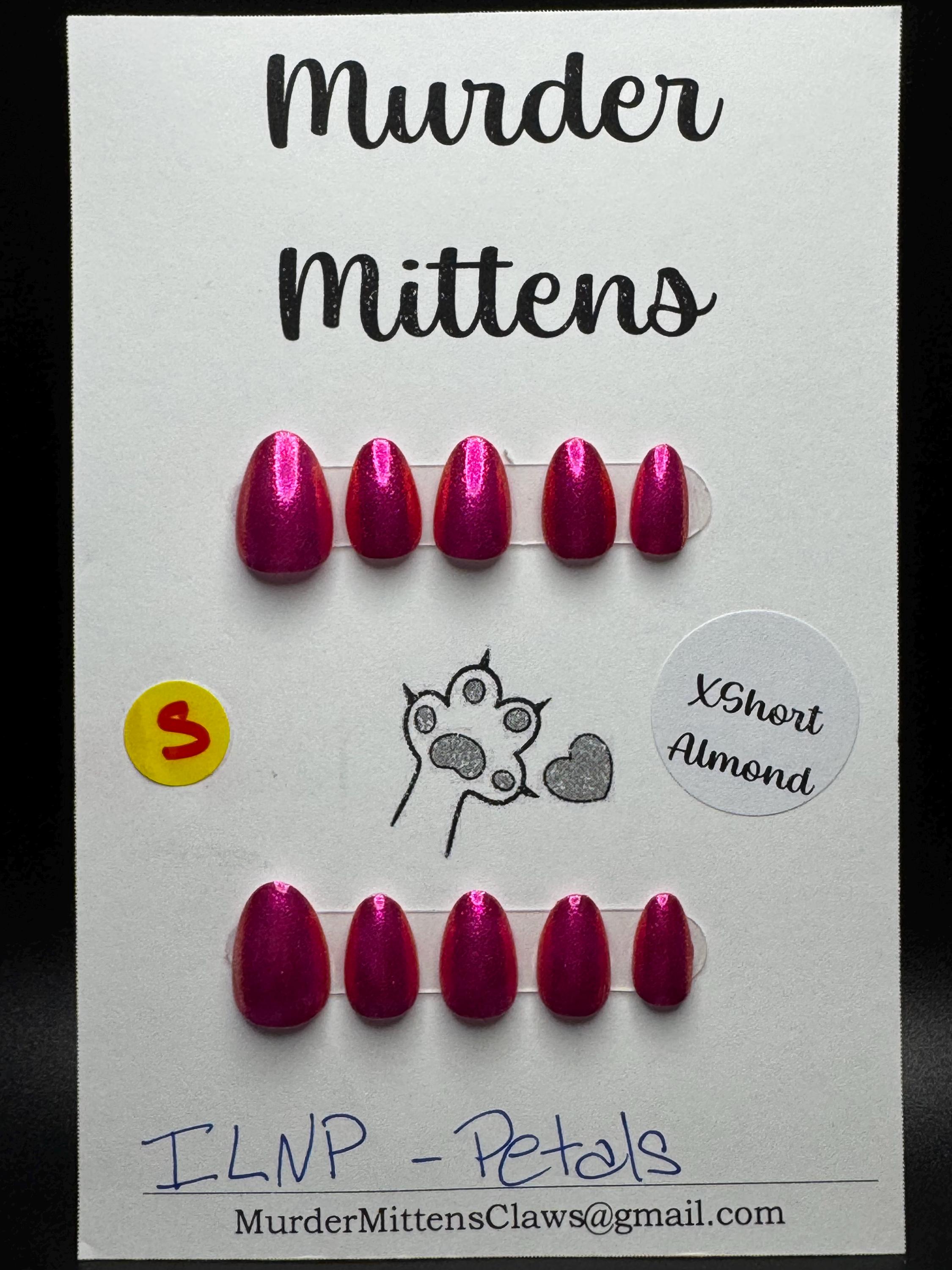 The polish is ILNP, Petals, with a glossy gel top coat. The size is Small, and the style is XtraShort Almond. The last pic is outside in the sun.