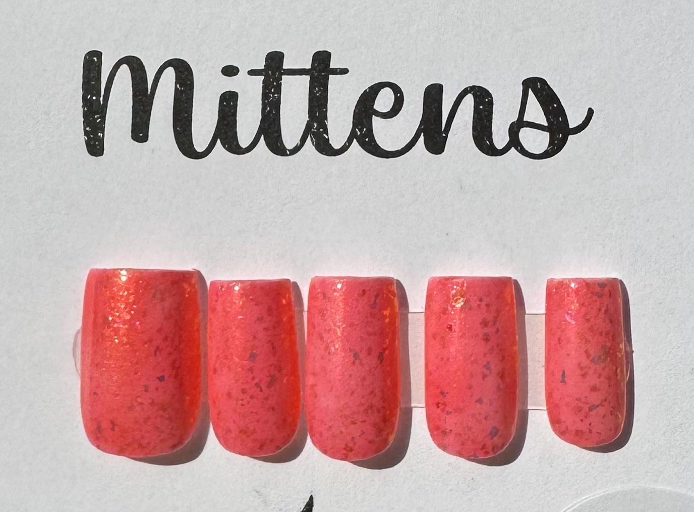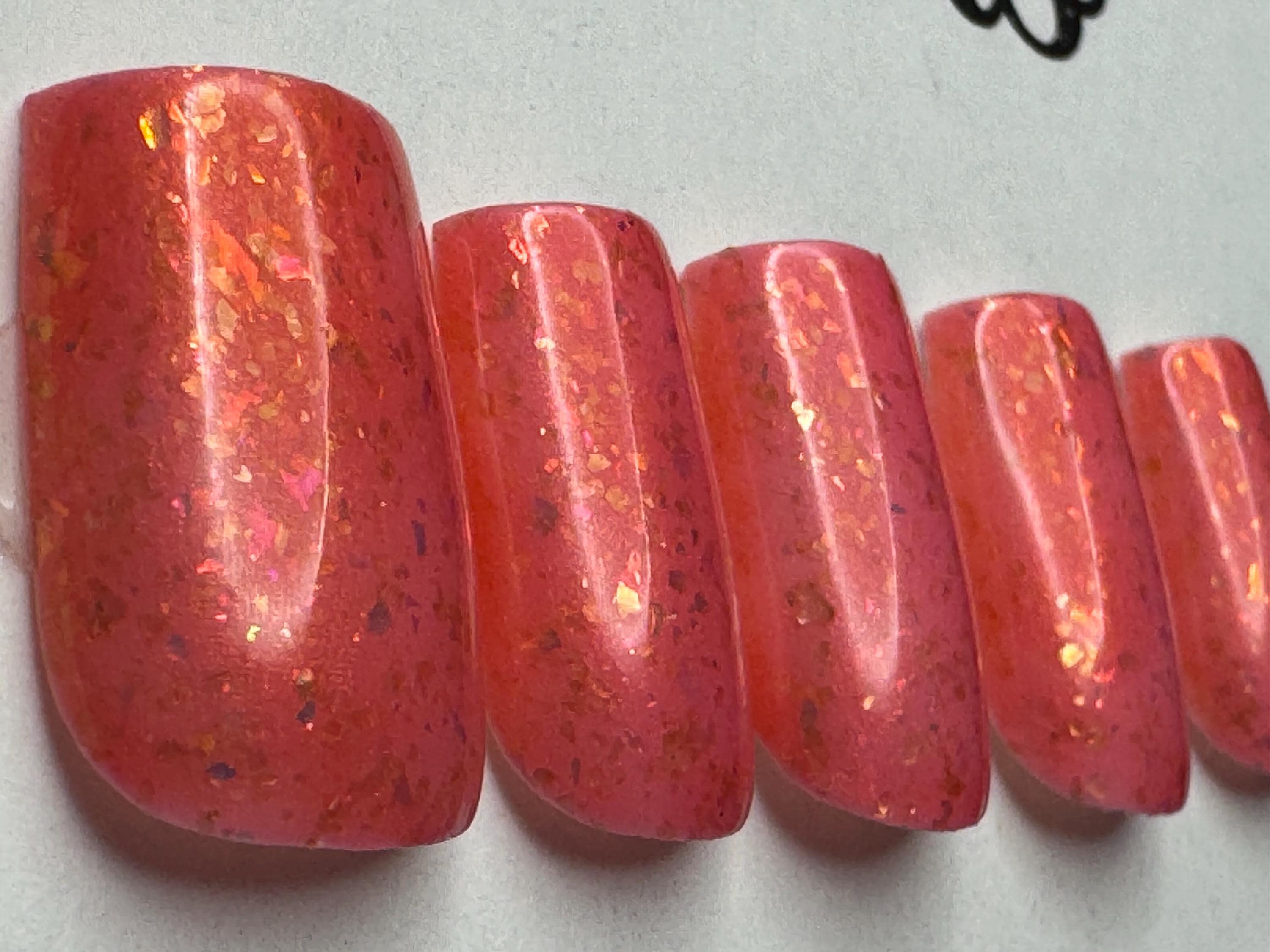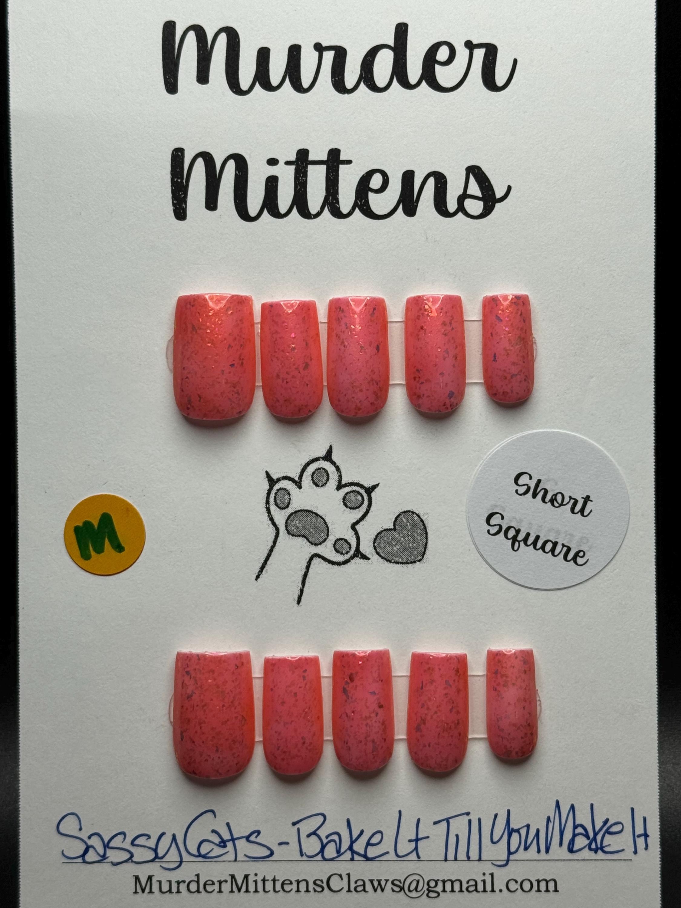 The polish is Sassy Cats Lacquer, Bake It Till You Make It, with a glossy gel top coat. The size is Medium, and the style is Short Square. The last pic is outside in the sun.