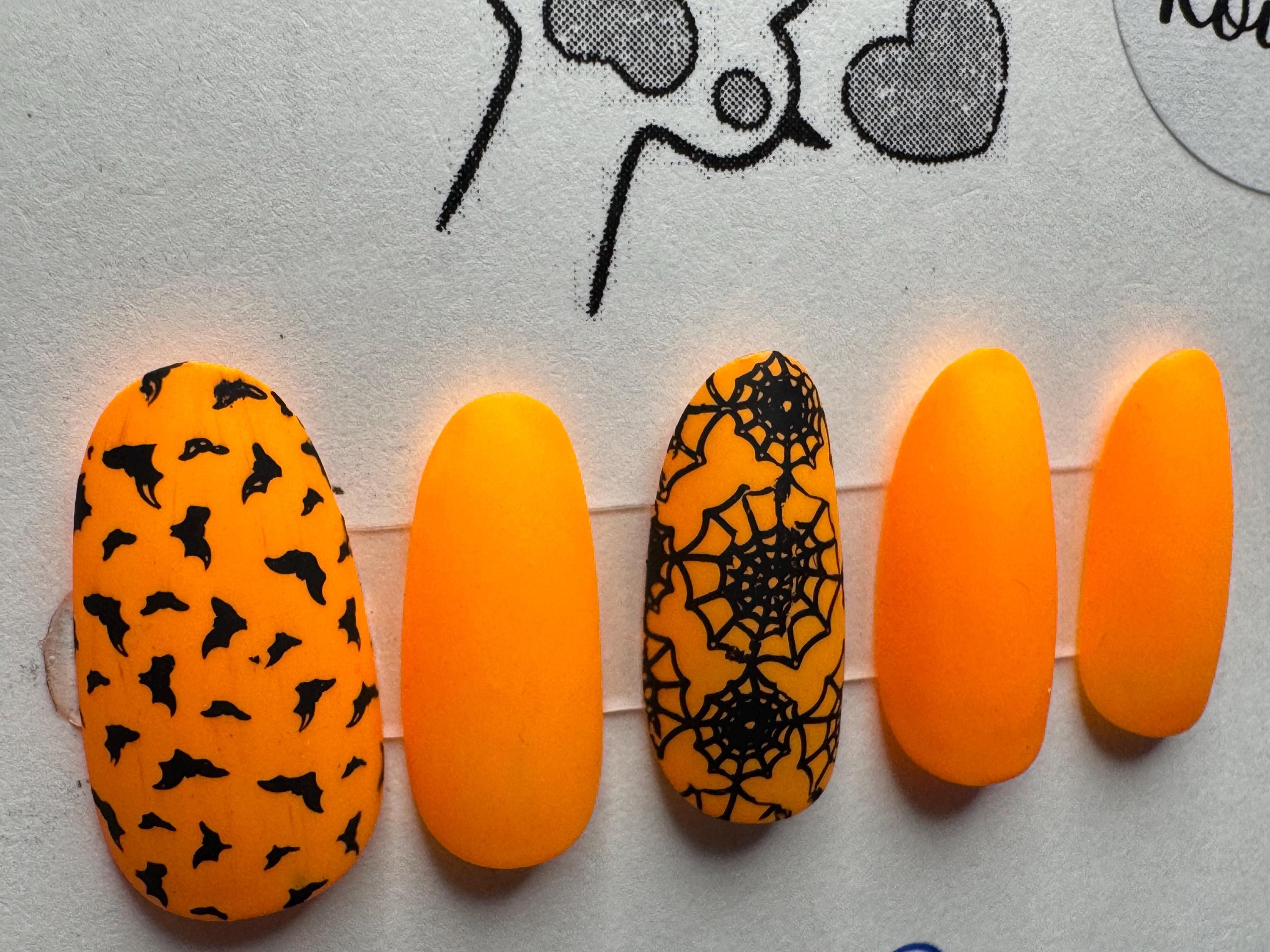 The base polish is ISN, Stalker Alert, with black Halloween stamping and a matte gel top coat. The size is Medium, and the style is Medium Round. The last pic is outside in the sun.