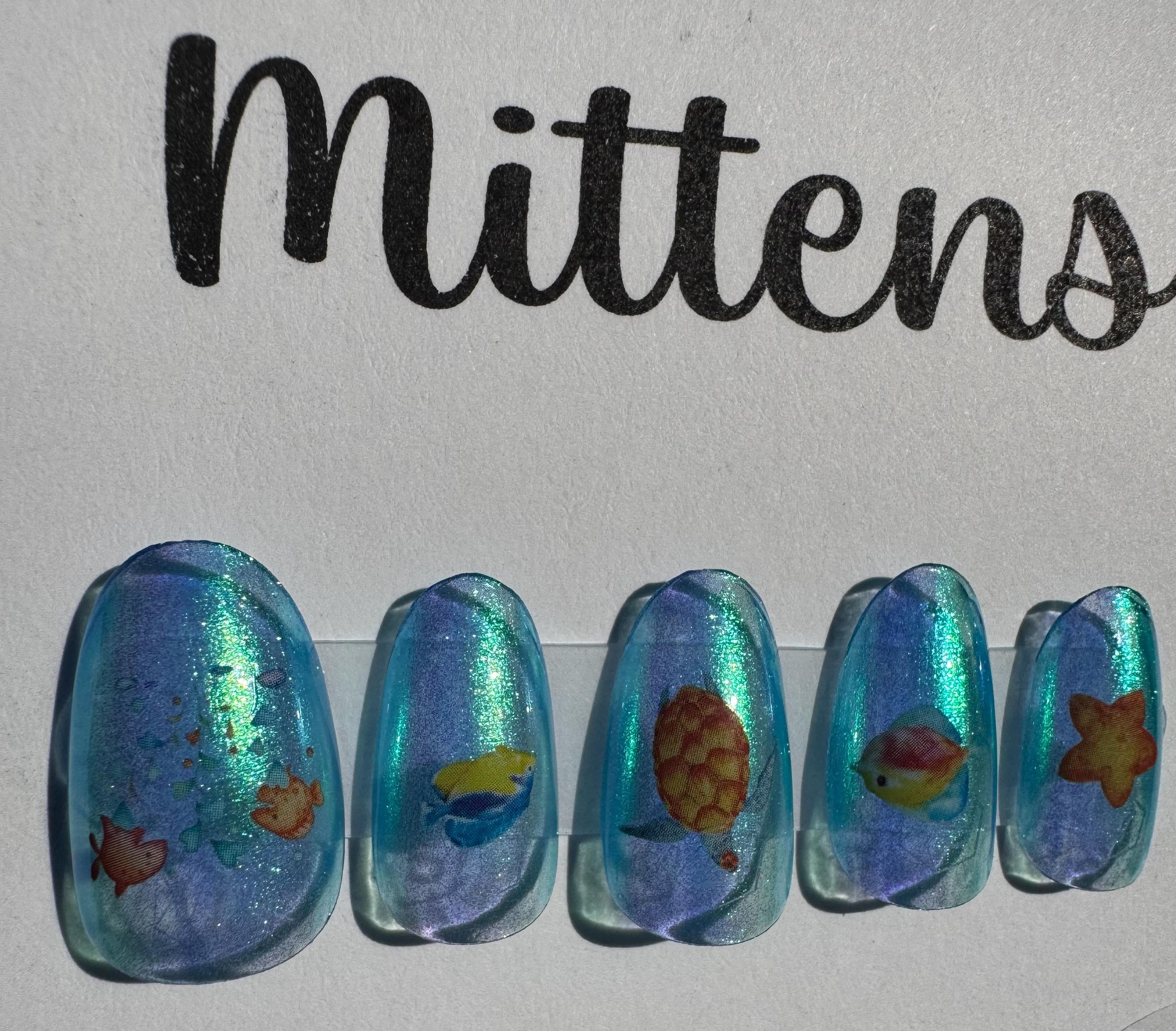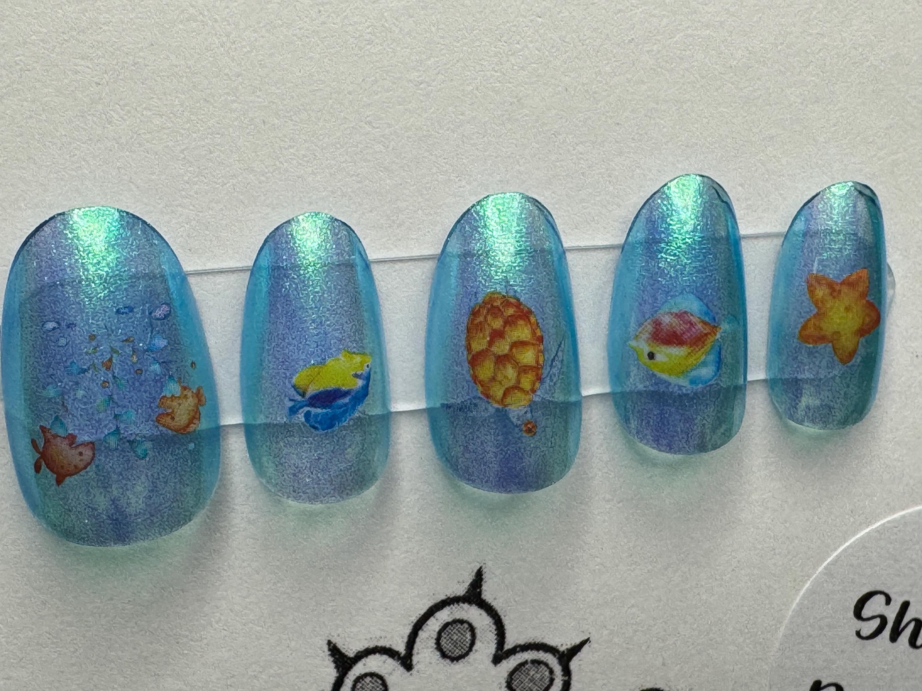 The polish is Paint It Pretty Polish, Cruising, with a glossy gel top coat. The size is Medium, and the style is Short Round. The third pic is outside in the sun. The stickers are ocean life.