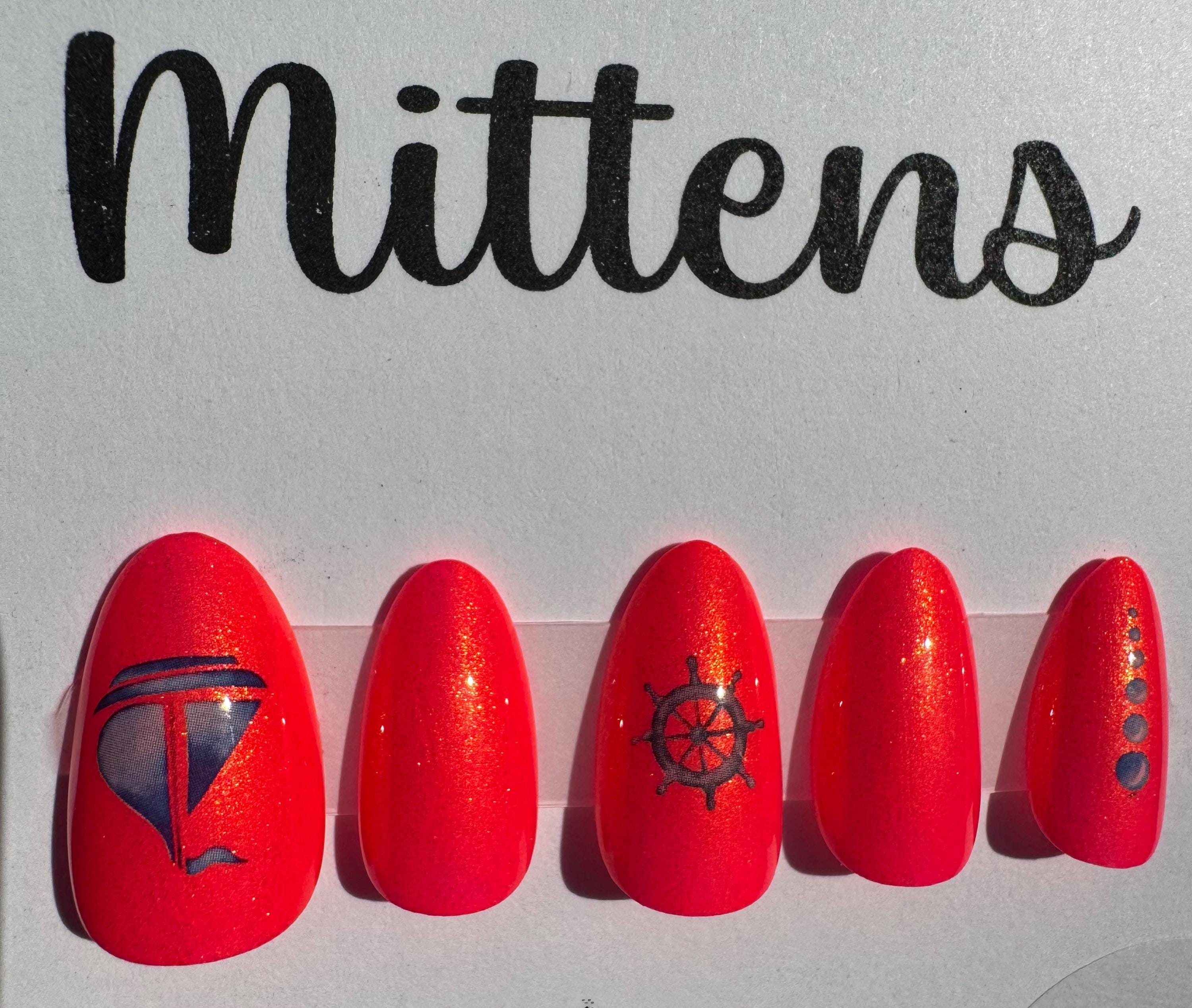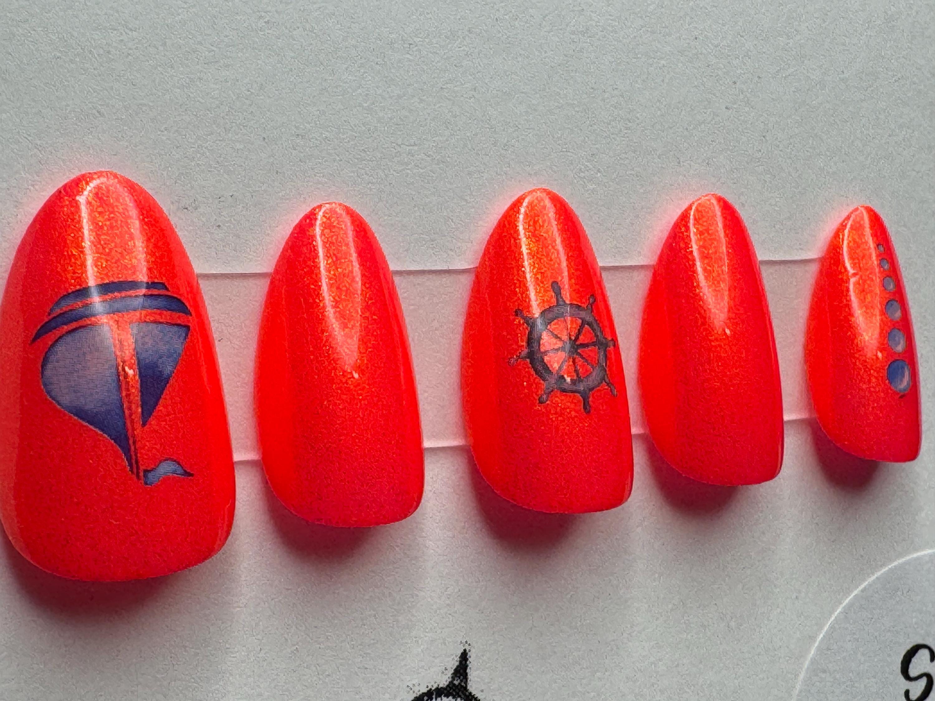 The polish is Atomic Polish, Shantay, You Stay, with a glossy gel top coat. The size is Medium, and the style is Short Almond. The third pic is outside in the sun. The stickers are sailing related.