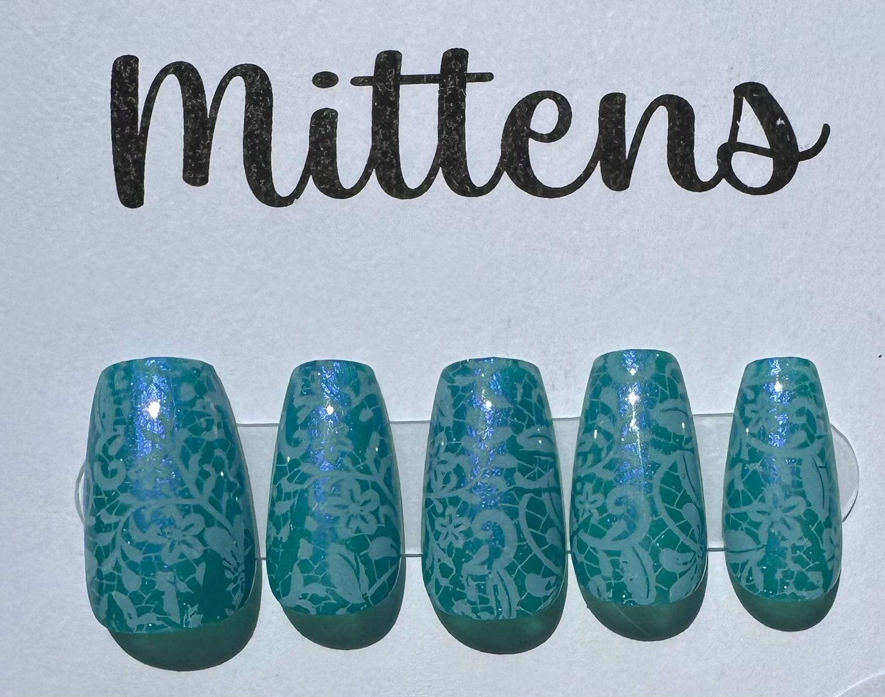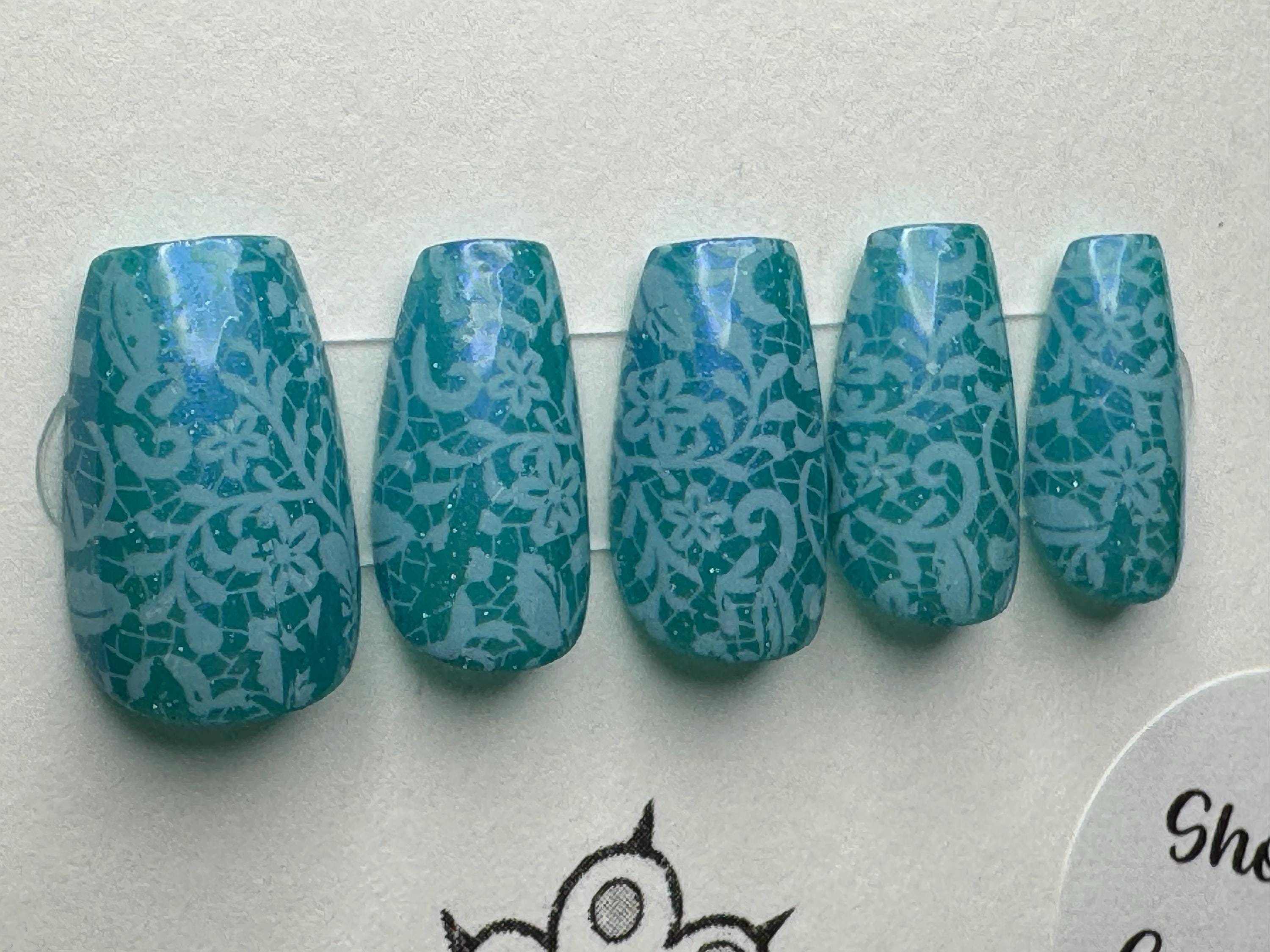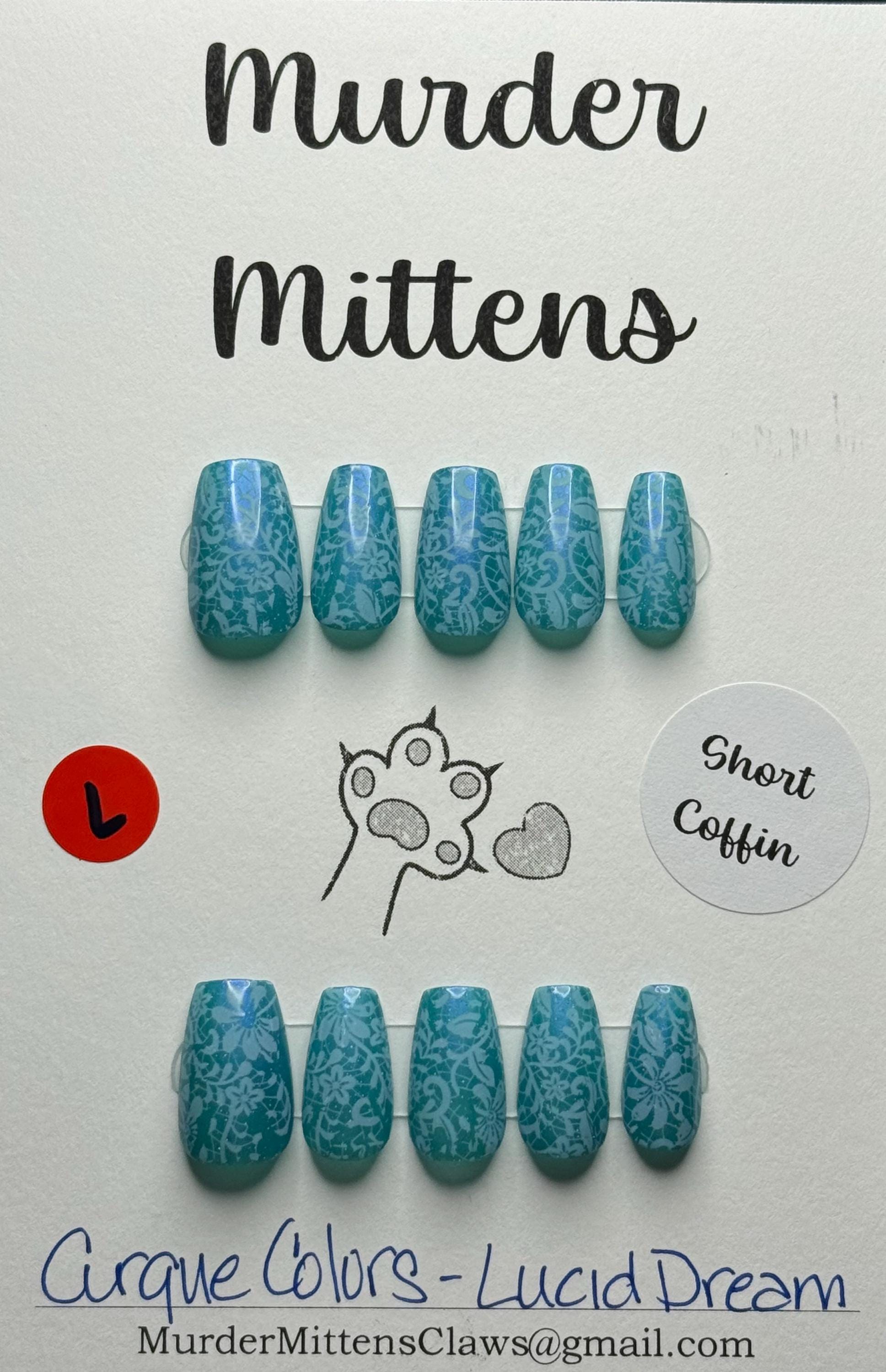 The polish is Cirque Colors, Lucid Dream, with a glossy gel top coat. The size is Large, and the style is Short Coffin. The third pic is outside in the sun.