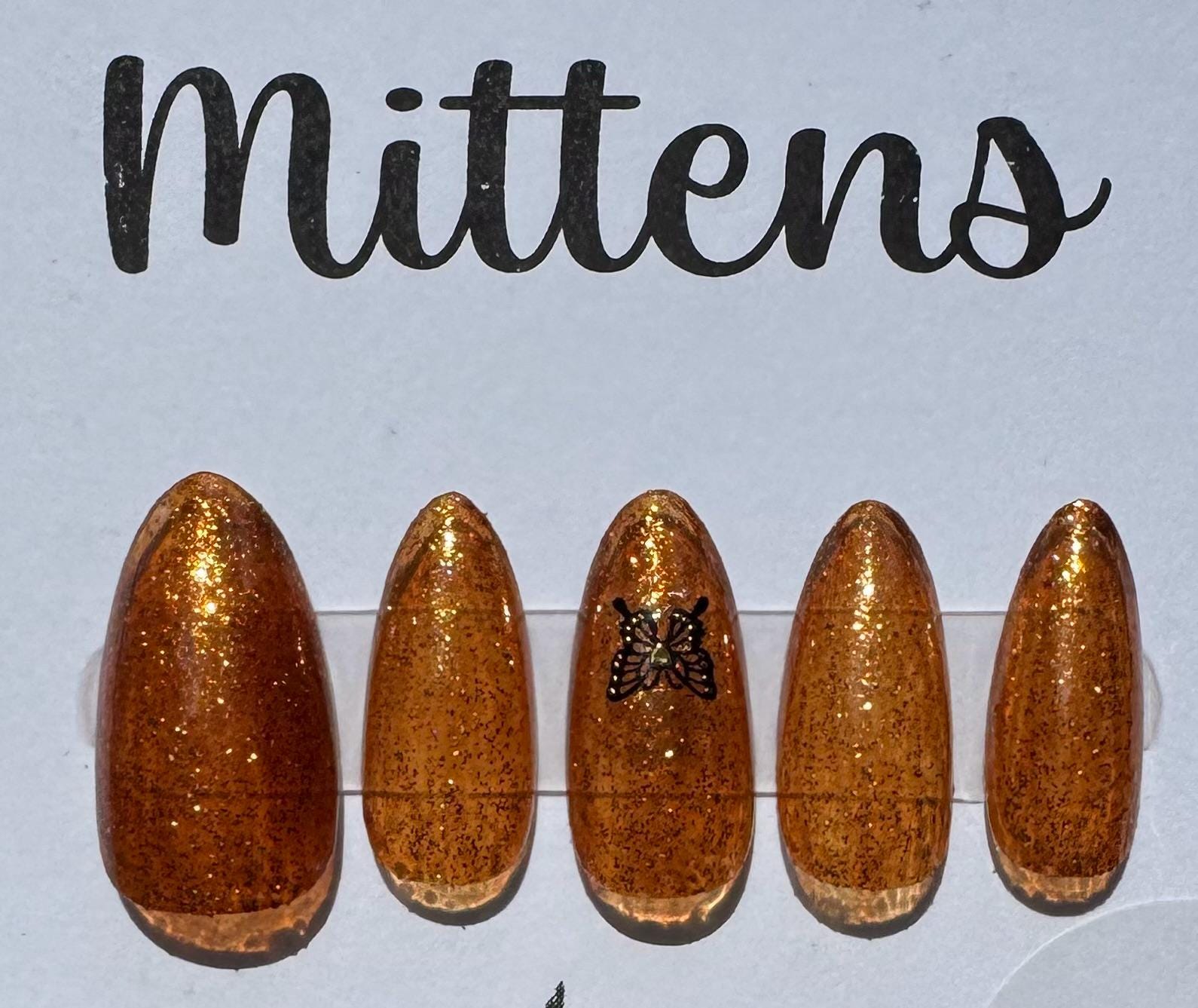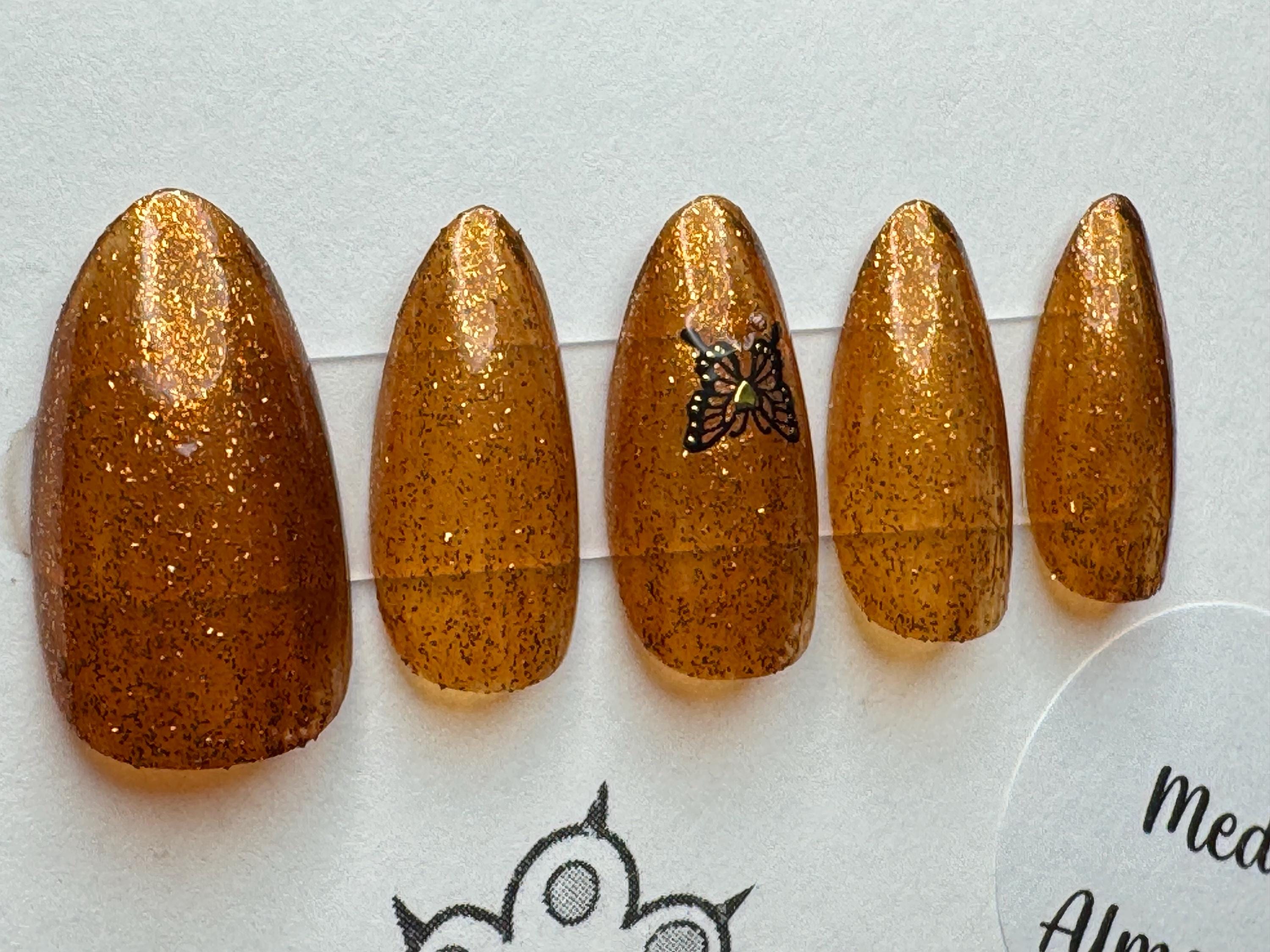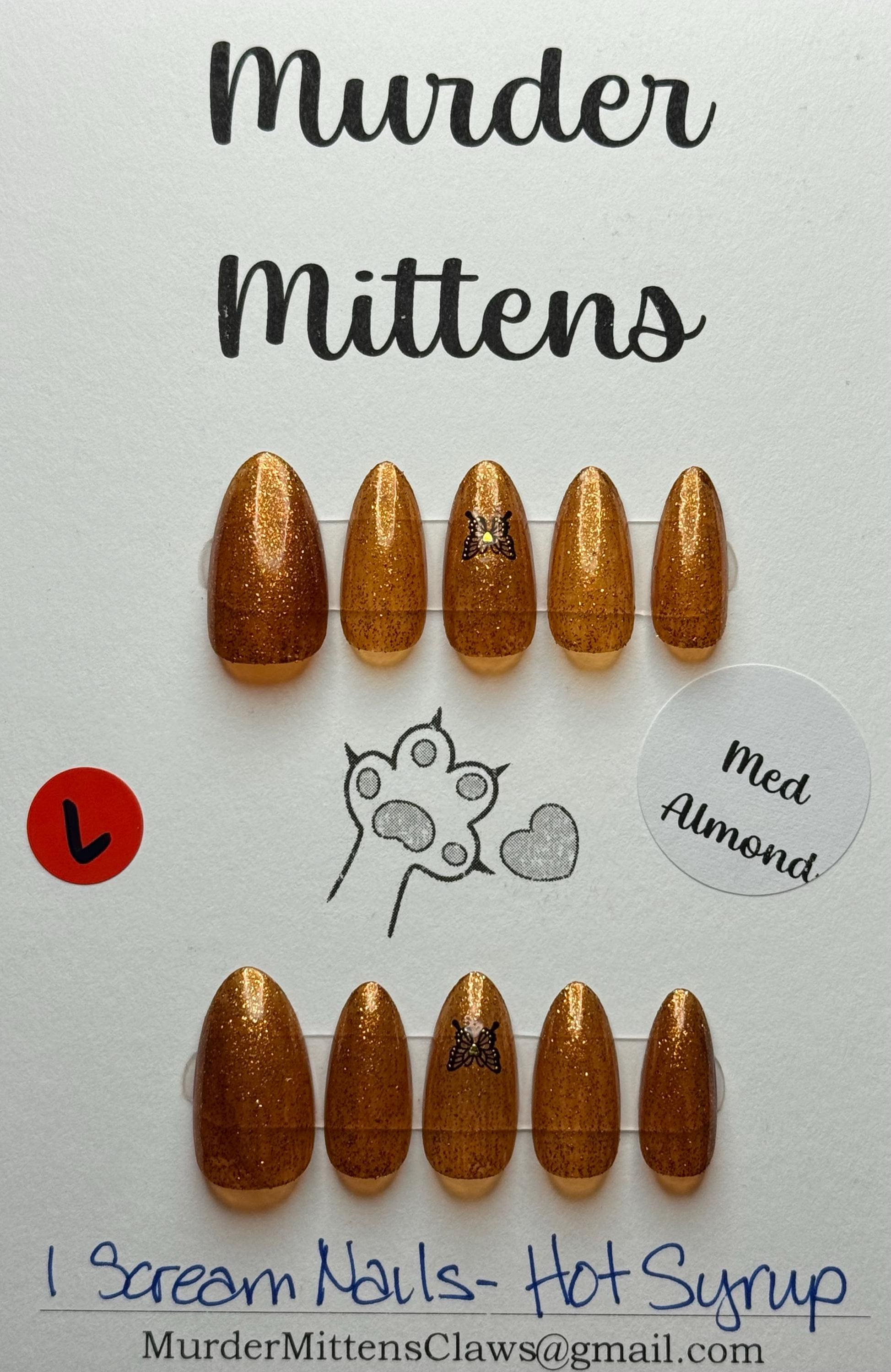 The polish is I Scream Nails, Hot Syrup, with a glossy gel top coat. The size is Large, and the style is Medium Almond. The third pic is outside in the sun. The sticker is a butterfly.