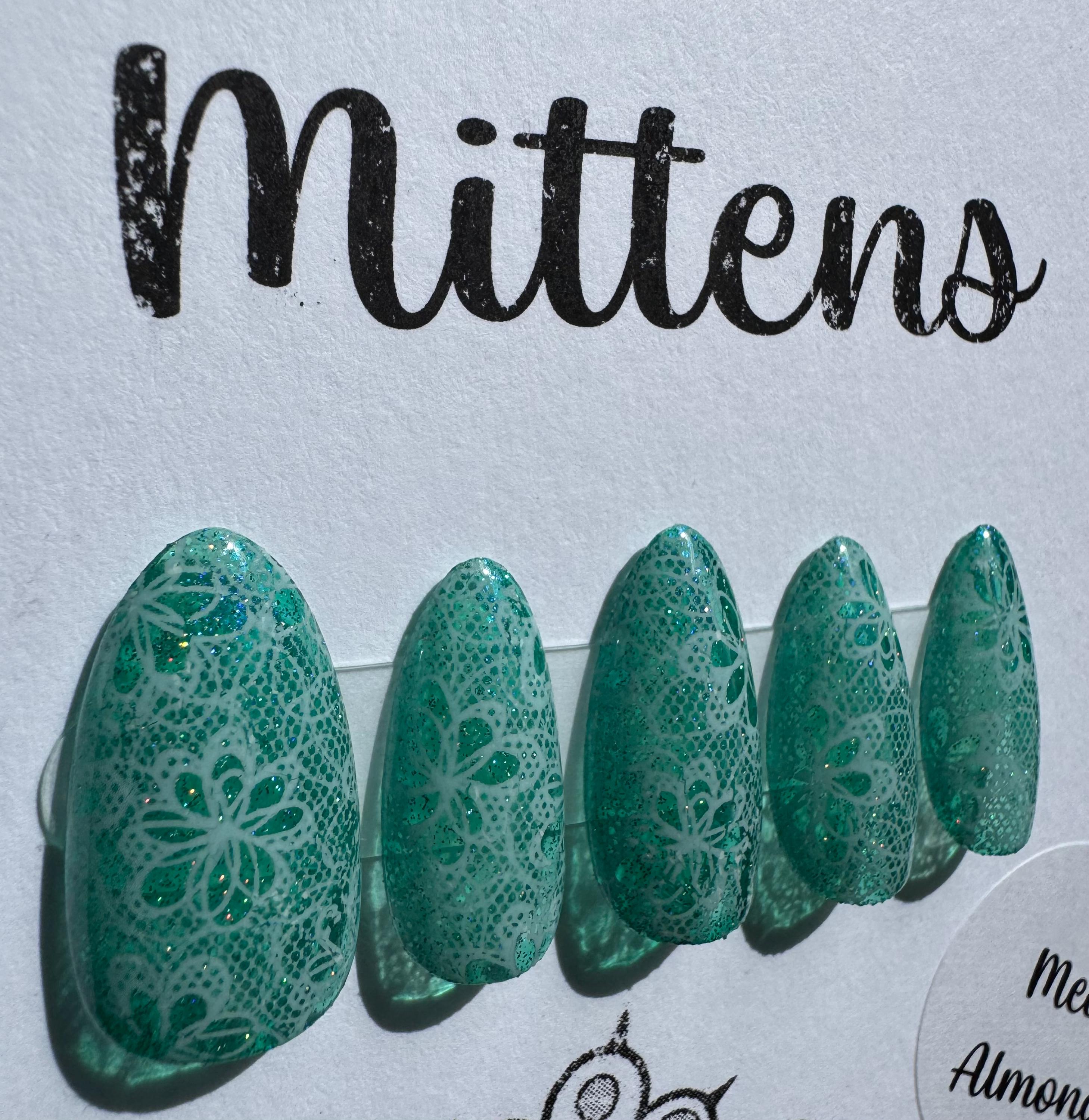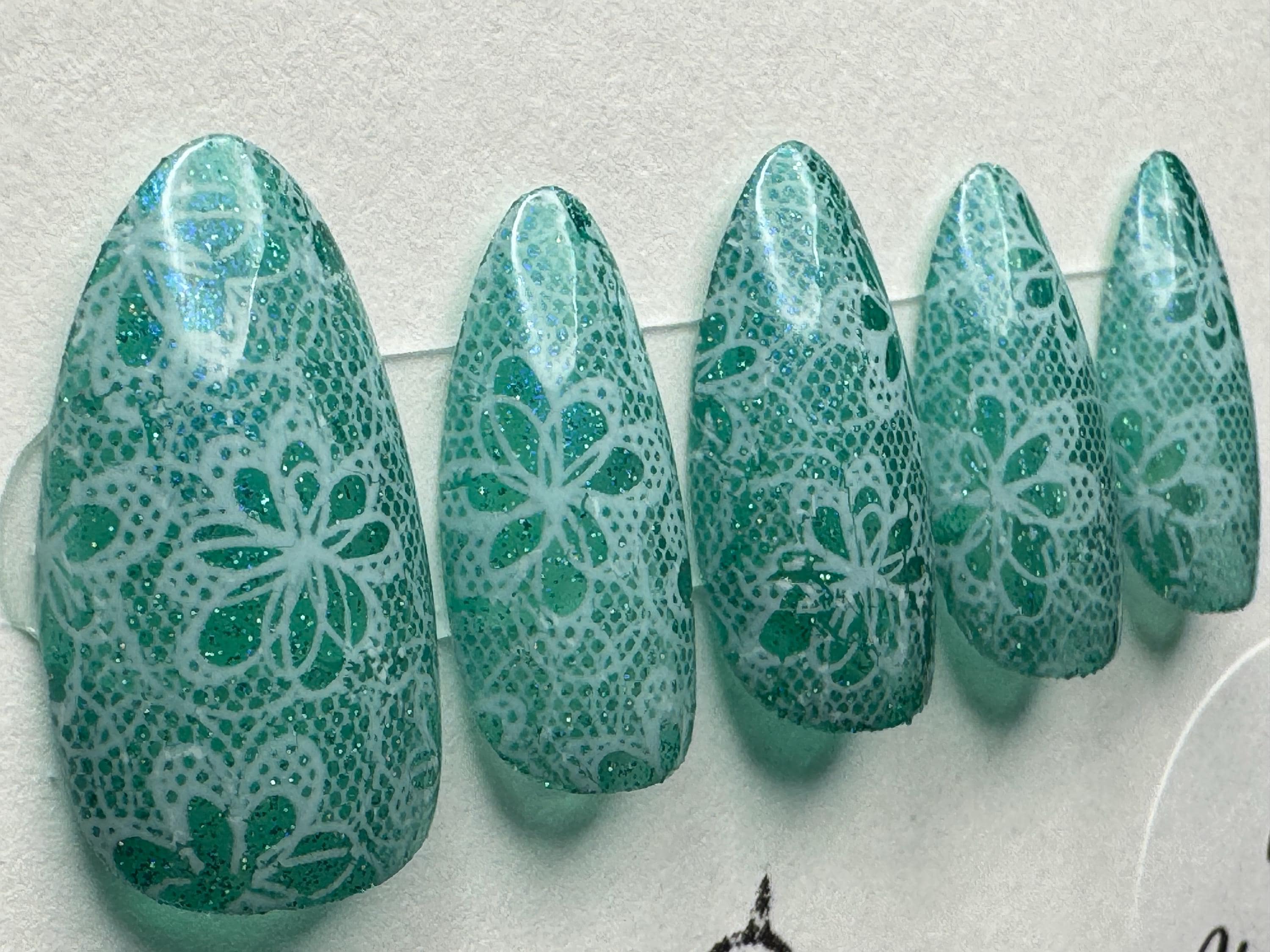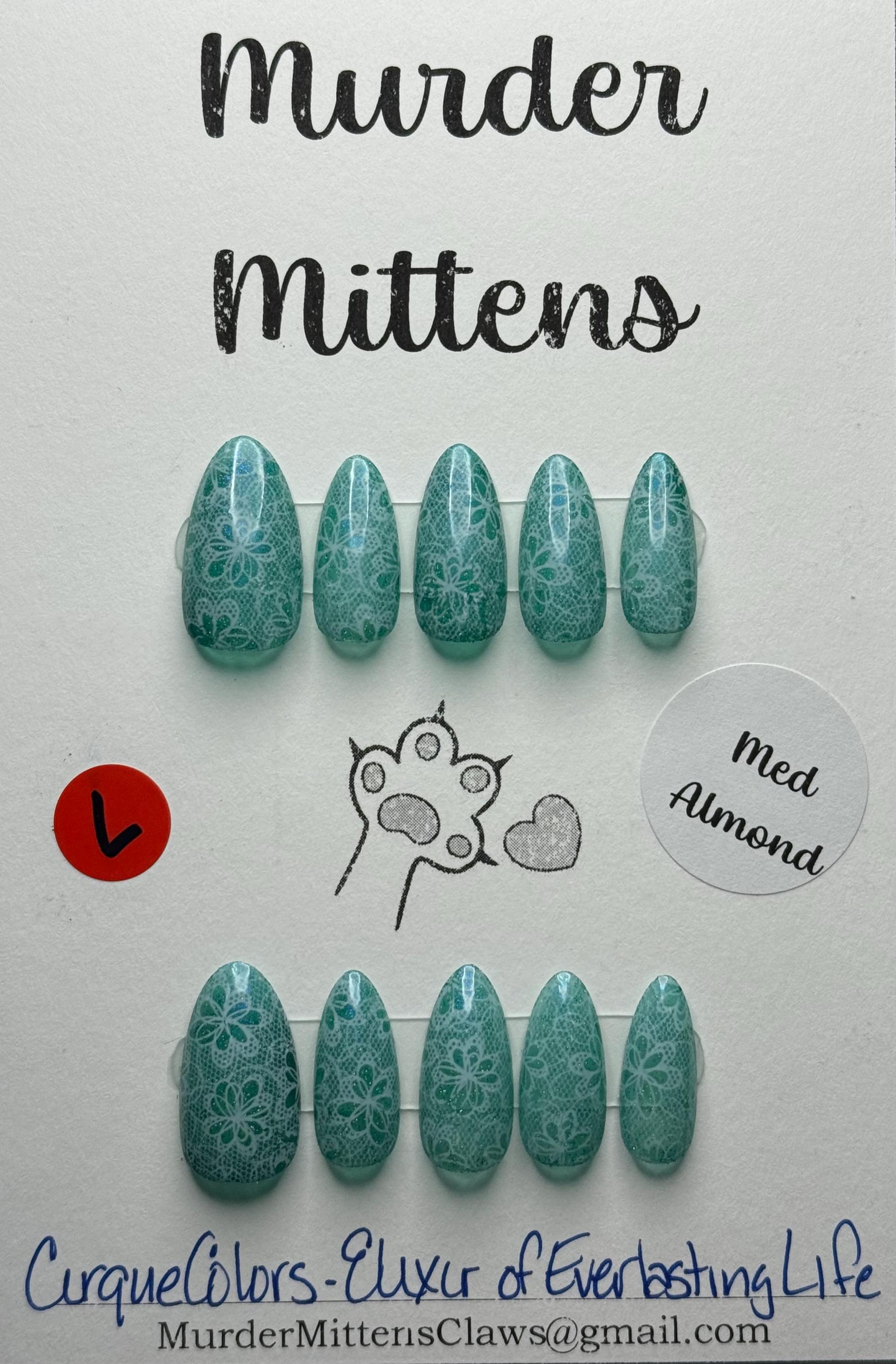 The polish is Cirque Colors, Elixir of Everlasting Life, with white lace and a glossy gel top coat. The size is Large, and the style is Medium Almond. The third pic is outside in the sun.